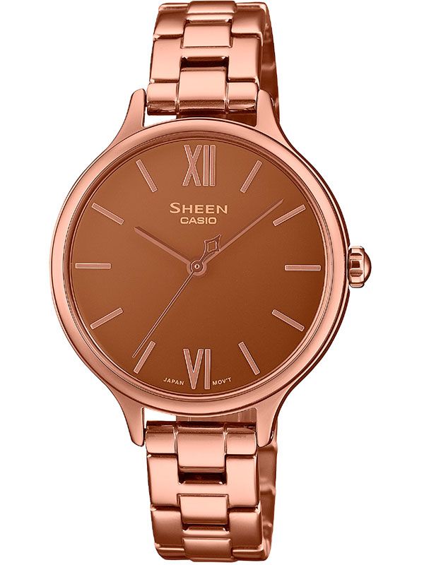 Женские кварцевые аналоговые наручные часы. Серия Sheen. Центральные часовые, минутная и секундная стрелки. Коричневый циферблат с часовыми индексами в виде штрихов и 2-х римских цифр. Круглый корпус из нержавеющей стали с покрытием цвета розового золота. Диаметр корпуса 32 мм, толщина 7,6 мм. Устойчивое к мелким царапинам сапфировое стекло. Браслет из нержавеющей стали с покрытием цвета розового золота, раскладывающаяся застёжка. Водозащита 50 WR (мытьё рук, дождь). Вес около 56 г.