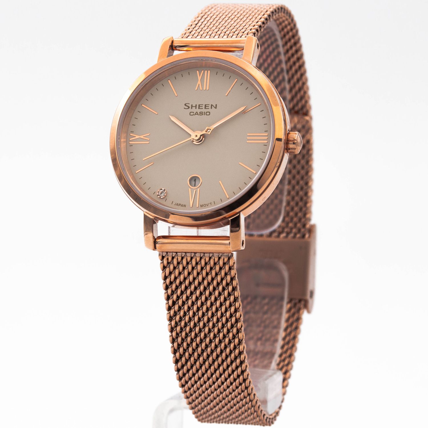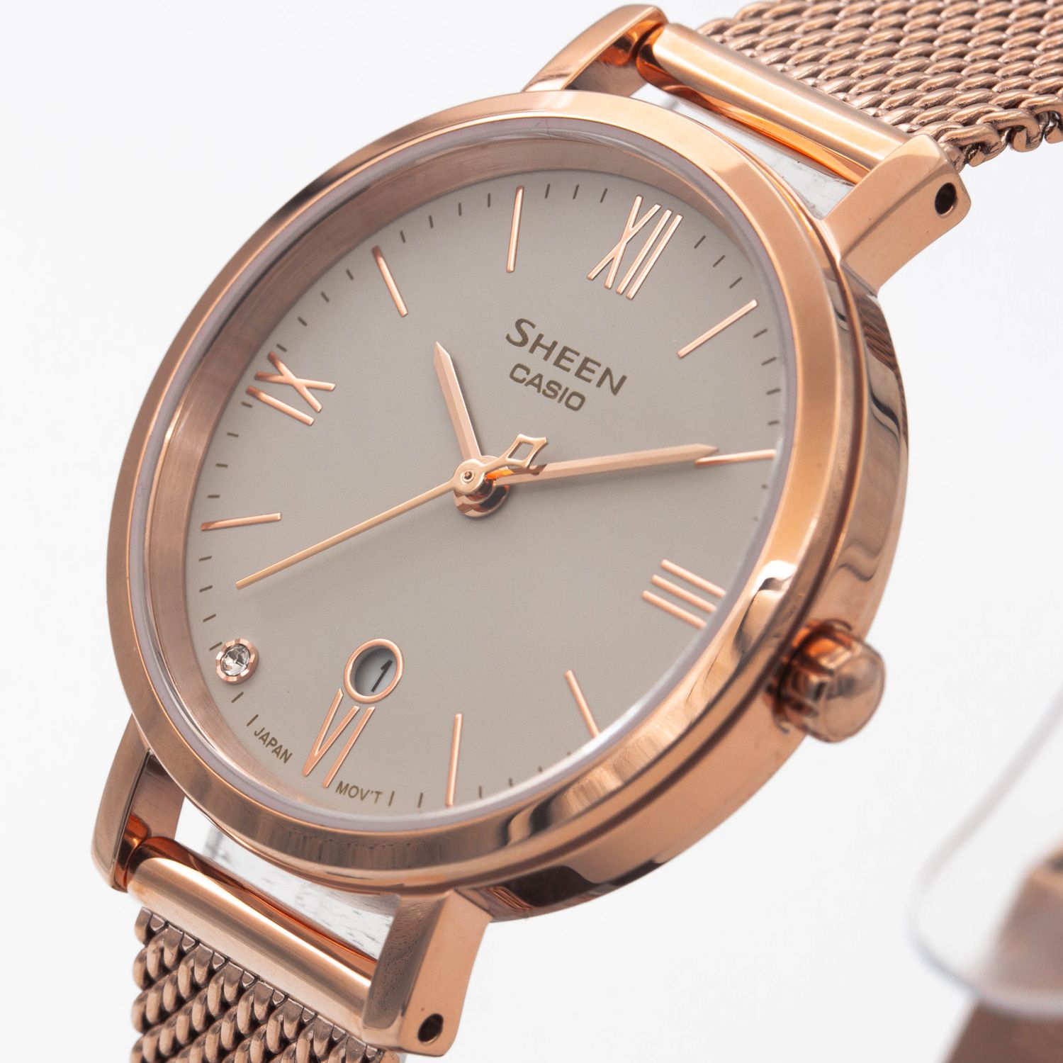 Женские кварцевые аналоговые наручные часы. Серия Casio Sheen. Центральная секундная стрелка. Циферблат украшен кристаллом. Окошко даты. Сапфировое стекло. Круглый стальной корпус. Стальной браслет миланского плетения.