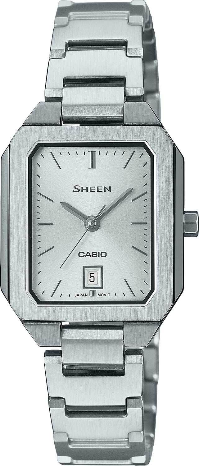 Женские кварцевые аналоговые часы. Серия Sheen. Центральные часовая, минутная и секундная стрелки. Серебристый циферблат с часовыми метками в виде штрихов и римской цифры XII. Окошко даты в положении 6 ч. (значение даты меняется до 31, для месяцев, у которых количество дней меньше 31, необходимо корректировать значение вручную). Прямоугольный стальной корпус размером 23,5 мм на 31,6 мм, толщиной 7,3 мм. Устойчивое к возникновению царапин сапфировое стекло. Стальной браслет с тройной раскладывающейся застежкой. Батарейка рассчитана на 3 года. Водостойкость WR 50 (мытье рук, дождь). Вес примерно 60г.