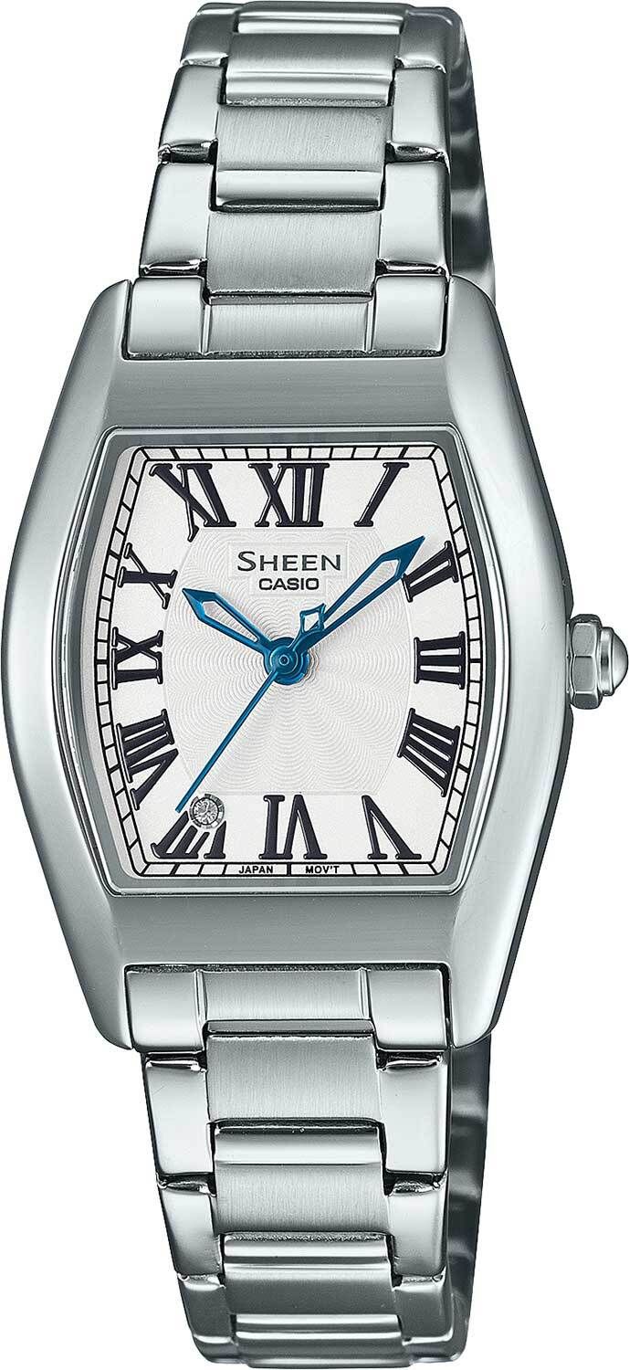 Женские кварцевые наручные часы c аналоговым отображением времени. Серия Sheen. Центральные часовая, минутная и секундная стрелки синего цвета. Белый циферблат с часовыми метками в виде римских цифр. Циферблат украшен кристаллом в позиции 7 часов. Корпус из нержавеющей стали. Размер корпуса 34 мм на 25 мм, толщина 7,9 мм. Рифлёная переводная головка. Устойчивое к возникновению мелких царапин сапфировое стекло сферической формы. Стальной браслет с тройной раскладывающейся застежкой. Батарейка рассчитана на 3 года. Водонепроницаемость 50WR (мытьё рук, дождь). Вес около 60 г.