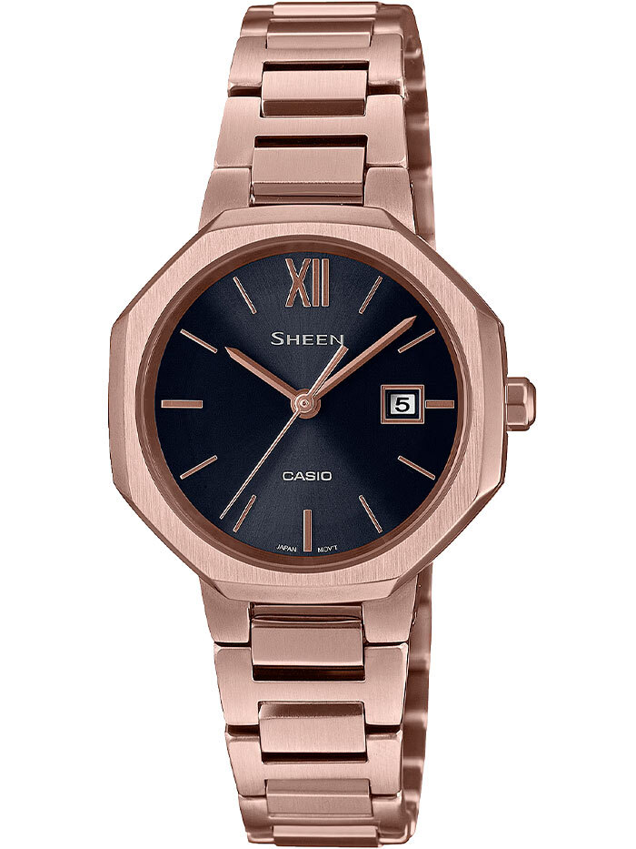 Женские кварцевые наручные часы с аналоговым отображением времени. Серия Sheen Solar. Питание от солнечной энергии - источником питания служит светочувствительная панель и аккумулятор, заряжаемый при попадании солнечного света на циферблат часов. Индикатор уровня заряда батареи. Время работы аккумулятора без подзарядки приблизительно 5 месяцев. Центральные часовая, минутная и секундная стрелки золотистого цвета. Чёрный циферблат с часовыми метками в виде штрихов и двух римских цифр VI и XII. Окошко даты в положении 3 часов. Восьмиугольный стальной корпус с IP покрытием цвета розового золота. Размер корпуса 28 мм на 33,5 мм, толщина 7,4 мм. Устойчивое к возникновению царапин сапфировое стекло. Стальной браслет с IP покрытием цвета розового золота. Водонепроницаемость WR50 (мытье рук, дождь). Вес около 58г.