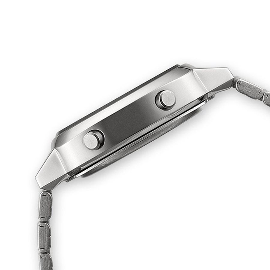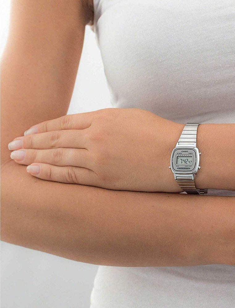 Миниатюрные женские кварцевые наручные часы c цифровым отображением времени на каждый день. Коллекция Casio Vintage. Секундомер с точностью показаний 1/10 секунды и временем измерения 1 час. Режимы измерения: отдельные отрезки времени. Таймер обратного отсчета с 7-ю предустановленными интервалами измерений: 1, 3, 5, 10, 15, 20 и 30 мин. 12/24-х часовой формат отображения времени. Ежедневный будильник, ежечасный сигнал. Автоматический календарь. Прямоугольный корпус из полимерного пластика серебристого цвета. Размер корпуса 24,6 мм на 30,3мм, толщина 7,3мм. Пластиковое стекло. Стальной браслет с регулируемой застежкой.. Стальная задняя крышка. Батарейка рассчитана на 2 года. Водонепроницаемость 30WR (защита от брызг). Вес около 28 г.