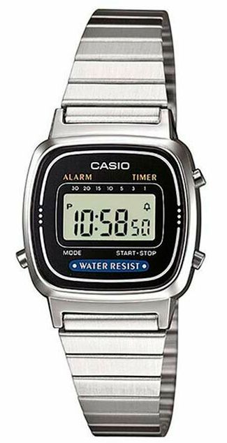 Миниатюрные женские кварцевые наручные часы на каждый день c цифровым отображением времени. Коллекция Vintage. Секундомер с точностью показаний 1/10 секунды и временем измерения 1 час. Режимы измерения: прошедшее время, время прохождения круга и время окончания. Таймер обратного отсчета с 7-ю предустановленными интервалами измерений: 1, 3, 5, 10, 15, 20 и 30 мин. 12/24-х часовой формат отображения времени. Ежедневный будильник, ежечасный сигнал. Автоматический календарь. Прямоугольный корпус из полимерного пластика серебристого цвета. Размер корпуса 24,6 мм на 30,3мм, толщина 7,3мм. Пластиковое стекло. Стальной браслет с регулируемой застежкой. Стальная задняя крышка. Батарейка рассчитана на 2 года. Водонепроницаемость 30WR (защита от брызг). Вес около 26 г.