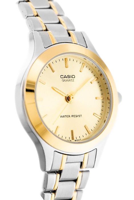 Женские кварцевые аналоговые наручные часы. Серия Casio Collection. Центральные часовая, минутная и секундная стрелки золотистого цвета. Золотистый циферблат с часовыми метками в виде штрихов выполнен по технологии Sunray (солнечные лучи). Круглый стальной корпус с IP покрытием цвета жёлтого золота на безеле. Размер корпуса 33 мм на 27 мм, толщина 7 мм. Устойчивое к мелким механическим повреждениям минеральное стекло. Рифлёная переводная головка в позиции 3 часов. Стальной браслет с частичным IP покрытием цвета жёлтого золота, раскладывающаяся застежка. Батарейка рассчитана на 3 года. Водонепроницаемость 30WR (защита от брызг). Вес около 38 г.