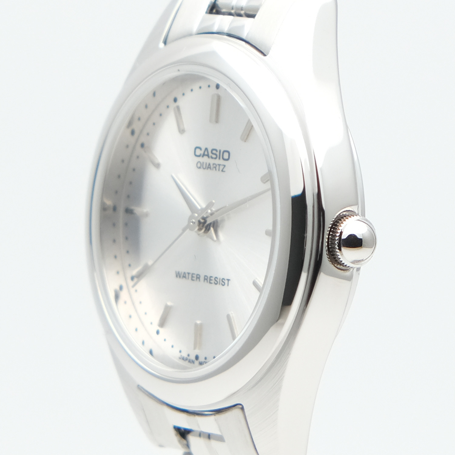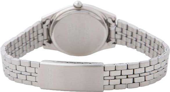 Женские аналоговые кварцевые наручные часы. Серия Casio Collection. Центральные часовая, минутная и секундная стрелки. Серебристый циферблат с часовыми метками в виде штрихов выполнен по технологии Sunray (солнечные лучи). Рифленая переводная головка. Круглый корпус серебристого цвета размером 26 мм на 32 мм, толщиной 7 мм. Устойчивое к мелким механическим повреждениям минеральное стекло. Стальной браслет с тройной раскладывающейся застежкой. Батарейка рассчитана на 3 года. Водонепроницаемость WR30 (защита от брызг). Вес около 38 г.