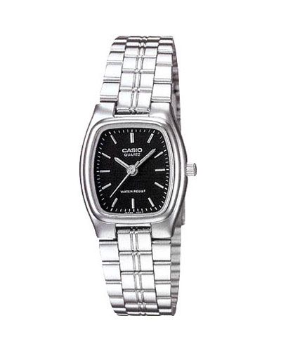 Женские кварцевые аналоговые наручные часы. Серия Casio Collection. Центральные часовая, минутная и секундная стрелки серебристого цвета. Чёрный циферблат с часовыми метками в виде штрихов серебристого цвета. Устойчивое к мелким механическим повреждениям минеральное стекло. Прямоугольный стальной корпус размером 28 мм на 22 мм, толщиной 6,9 мм. Рифлёная переводная головка. Стальной браслет с тройной раскладывающейся застежкой. Стальная задняя крышка. Батарейка рассчитана на 3 года. Водонепроницаемость 30WR (защита от брызг). Вес около 43 г.