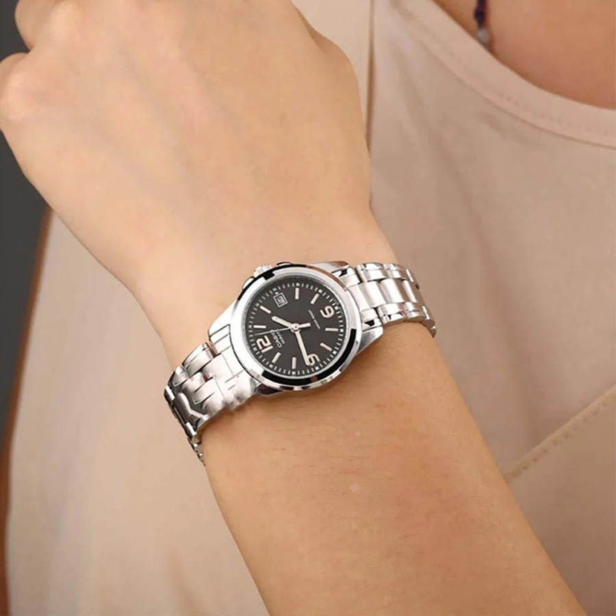 Женские кварцевые аналоговые наручные часы. Серия Casio Collection. Центральные часовая, минутная и секундная стрелки. Чёрный циферблат с часовыми метками в виде штрихов и трёх арабских цифр (12, 6 и 9). Стрелки и метки с люминесцентным покрытием, которое светится в темноте после непродолжительного воздействия света. Окошко даты в положении 3 ч. Устойчивое к мелким механическим повреждениям минеральное стекло. Круглый корпус серебристого цвета. Размер корпуса 28 мм на 32 мм, толщина 8.6 мм. Рифлёная переводная головка с защитой. Стальной браслет с тройной раскладывающейся застежкой. Батарейка рассчитана на 3 года. Водонепроницаемость 30WR (защита от брызг). Вес около 56 г.
