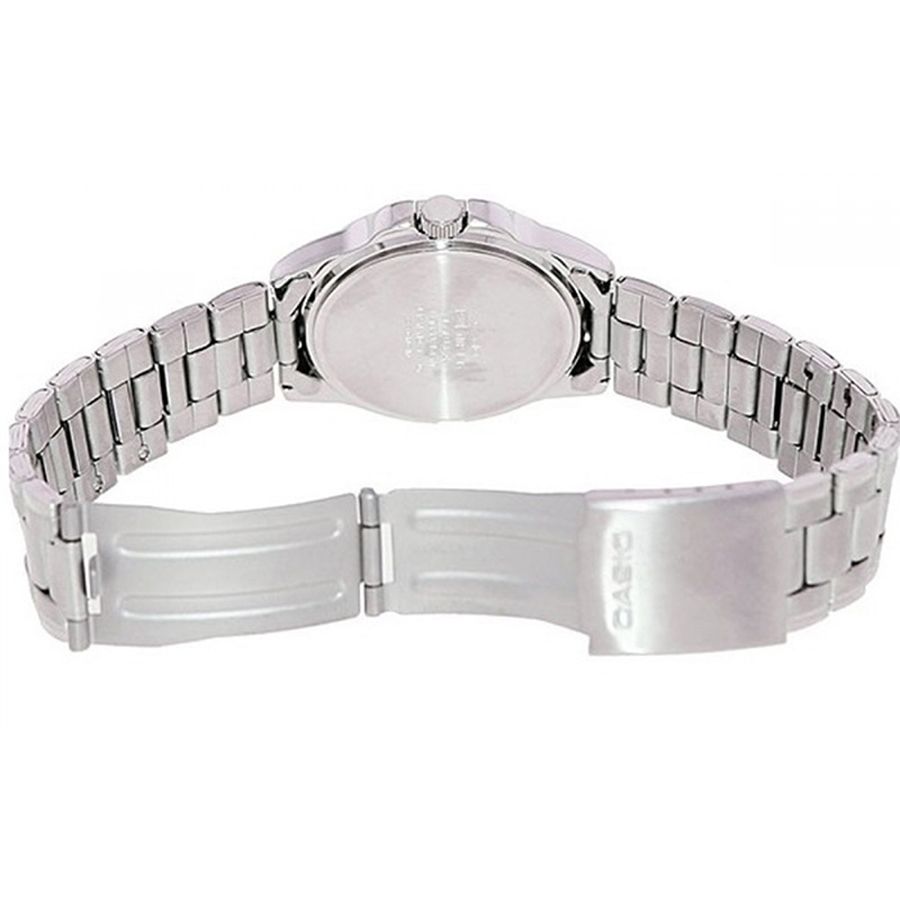 Женские кварцевые аналоговые наручные часы. Серия Casio Collection. Центральные часовая, минутная и секундная стрелки. Чёрный циферблат с часовыми метками в виде штрихов. Стрелки и метки с люминесцентным покрытием, которое светится в темноте после непродолжительного воздействия света. Окошко даты в положении 3 ч. Устойчивое к мелким механическим повреждениям минеральное стекло. Круглый корпус серебристого цвета. Размер корпуса 28 мм на 32 мм, толщина 8.6 мм. Рифлёная переводная головка с защитой. Стальной браслет с тройной раскладывающейся застежкой. Батарейка рассчитана на 3 года. Водонепроницаемость 30WR (защита от брызг). Вес около 56 г.