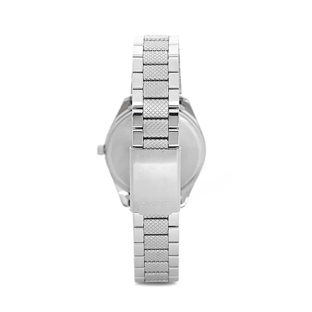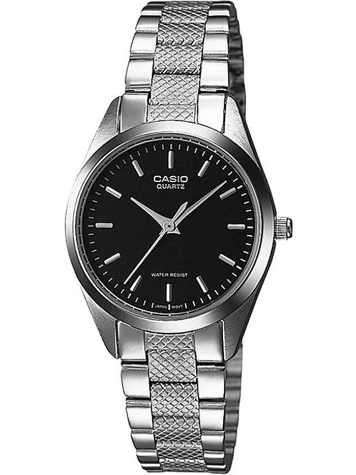 Женские кварцевые аналоговые наручные часы. Серия Casio Collection. Центральные часовая, минутная и секундная стрелки серебристого цвета. Чёрный циферблат с часовыми метками в виде штрихов выполнен по технологии Sunray (солнечные лучи). Устойчивое к мелким механическим повреждениям минеральное стекло. Круглый стальной корпус размером 26 мм на 32,5 мм, толщиной 6,2 мм. Рифлёная переводная головка. Стальной браслет с тройной раскладывающейся застежкой. Стальная задняя крышка. Водонепроницаемость 30WR (защита от брызг). Вес около 43 г.