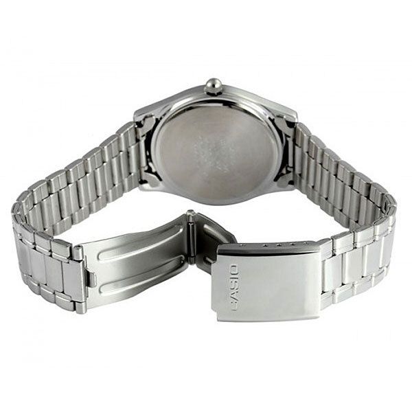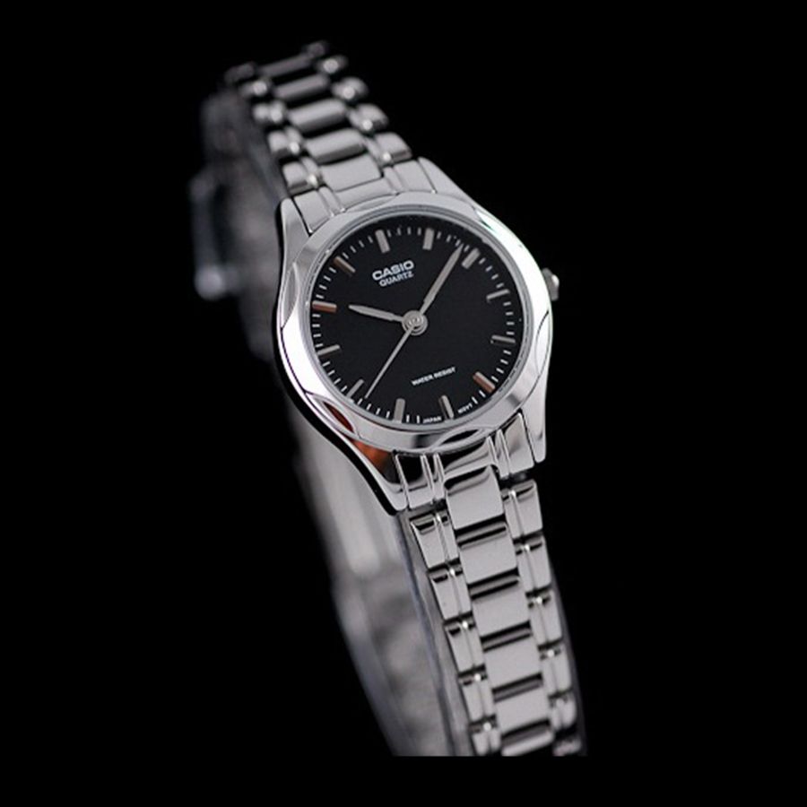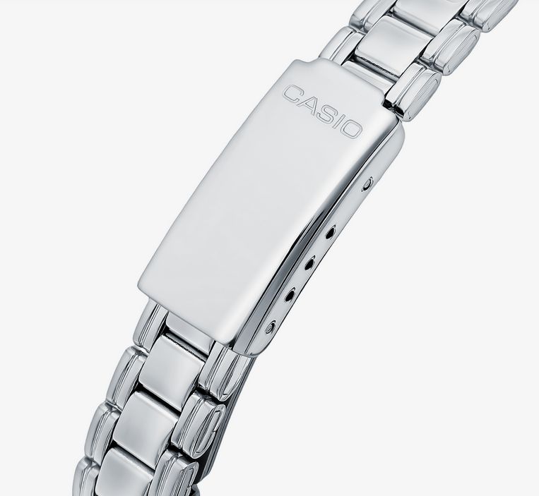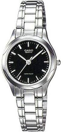 Женские кварцевые наручные часы с аналоговым отображением времени. Серия Casio Collection. Простые и лаконичные часы на каждый день. Центральные часовая, минутная и секундная стрелки серебристого цвета. Чёрный циферблат с часовыми метками в виде штрихов. Устойчивое к мелким механическим повреждениям минеральное стекло. Круглый стальной корпус. Размер корпуса 25 мм на 30 мм, толщина 6,7 мм. Рифлёная переводная головка. Стальной браслет с раскладывающейся застежкой. Батарейка рассчитана на 3 года. Водонепроницаемость 30WR (защита от брызг). Вес около 42 г.