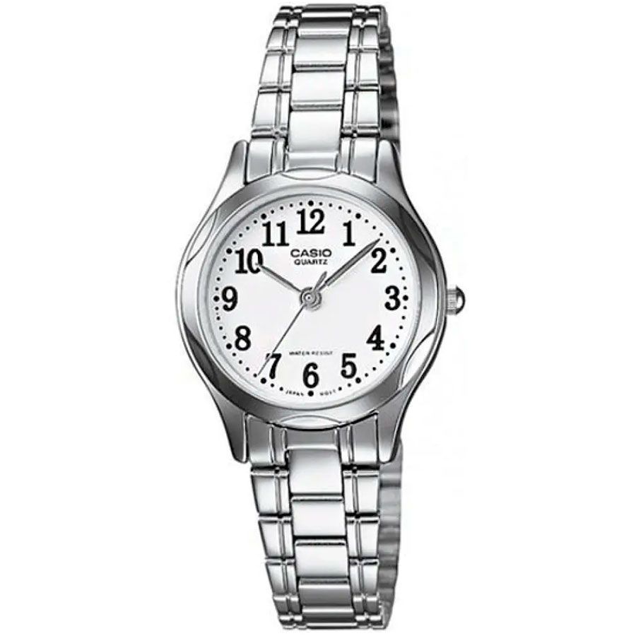 Женские кварцевые аналоговые наручные часы. Серия Casio Collection. Центральные часовая, минутная и секундная стрелки. Белый циферблат с часовыми метками в виде арабских цифр. Устойчивое к мелким механическим повреждениям минеральное стекло. Круглый корпус серебристого цвета. Размер корпуса 25 мм на 30 мм, толщина 6.7 мм. Рифлёная переводная головка в положении 3 ч. Стальной браслет с тройной раскладывающейся застежкой. Батарейка рассчитана на 3 года. Водонепроницаемость 30WR (защита от брызг). Вес около 42 г.