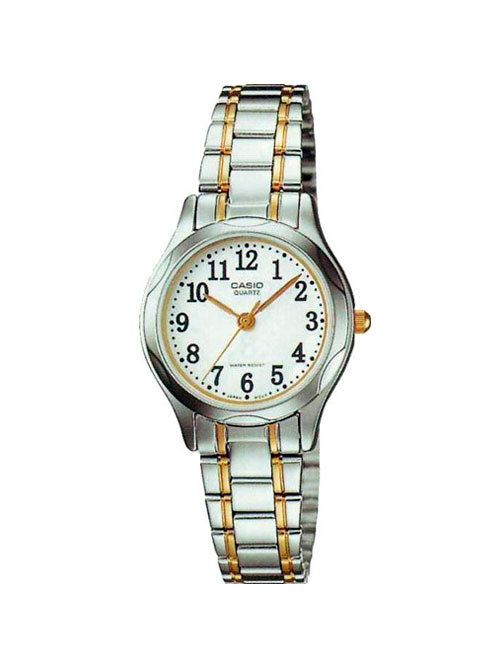 Женские кварцевые аналоговые наручные часы. Серия Casio Collection. Центральные часовая, минутная и секундная стрелки золотистого цвета. Белый циферблат с часовыми метками в виде арабских цифр. Устойчивое к мелким механическим повреждениям минеральное стекло. Круглый корпус серебристого цвета. Размер корпуса 25 мм на 30 мм, толщина 6.7 мм. Рифлёная переводная головка в положении 3 ч. Стальной браслет с частичным IP покрытием цвета розового золота, тройная раскладывающаяся застежка. Батарейка рассчитана на 3 года. Водонепроницаемость 30WR (защита от брызг). Вес около 42 г.