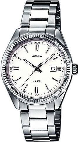 Женские аналоговые кварцевые часы. Серия Casio Collection. Центральные часовая, минутная и секундная стрелки. Белый циферблат с часовыми метками в виде штрихов. Стрелки с люминесцентным покрытием, которое светится в темноте после непродолжительного воздействия света. Окошко даты в позиции 3 ч. Минутная шкала на циферблате. Устойчивое к мелким механическим повреждениям минеральное стекло. Рифлёный безель. Круглый корпус из гипоаллергенной латуни серебристого цвета. Размер корпуса 34,5 мм на 30,2 мм, толщина 8,7 мм. Стальной браслет с тройной раскладывающейся застежкой. Батарея рассчитана на 3 года. Водонепроницаемость 50WR (допускается мытьё рук, брызги дождя). Вес около 70 г.