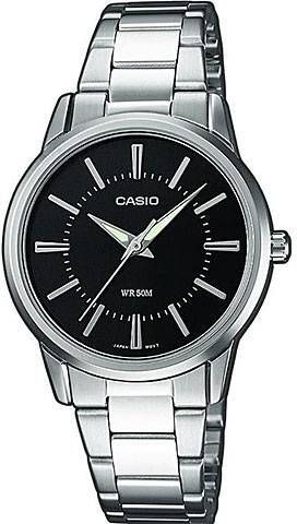 Женские кварцевые аналоговые часы. Серия Casio Collection. Центральные часовая, минутная и секундная стрелки. Чёрный циферблат с часовыми метками в виде штрихов. Стрелки с люминесцентным покрытием, которое светится в темноте после непродолжительного воздействия света. Устойчивое к мелким механическим повреждениям минеральное стекло. Круглый корпус из гипоаллергенной латуни серебристого цвета. Размер корпуса 35,5 мм на 30 мм, толщина 7,5 мм. Стальной браслет с тройной раскладывающейся застежкой. Срок службы батареи около 3 лет. Водонепроницаемость 50WR (допускается мытьё рук, брызги дождя). Вес около 65 г.