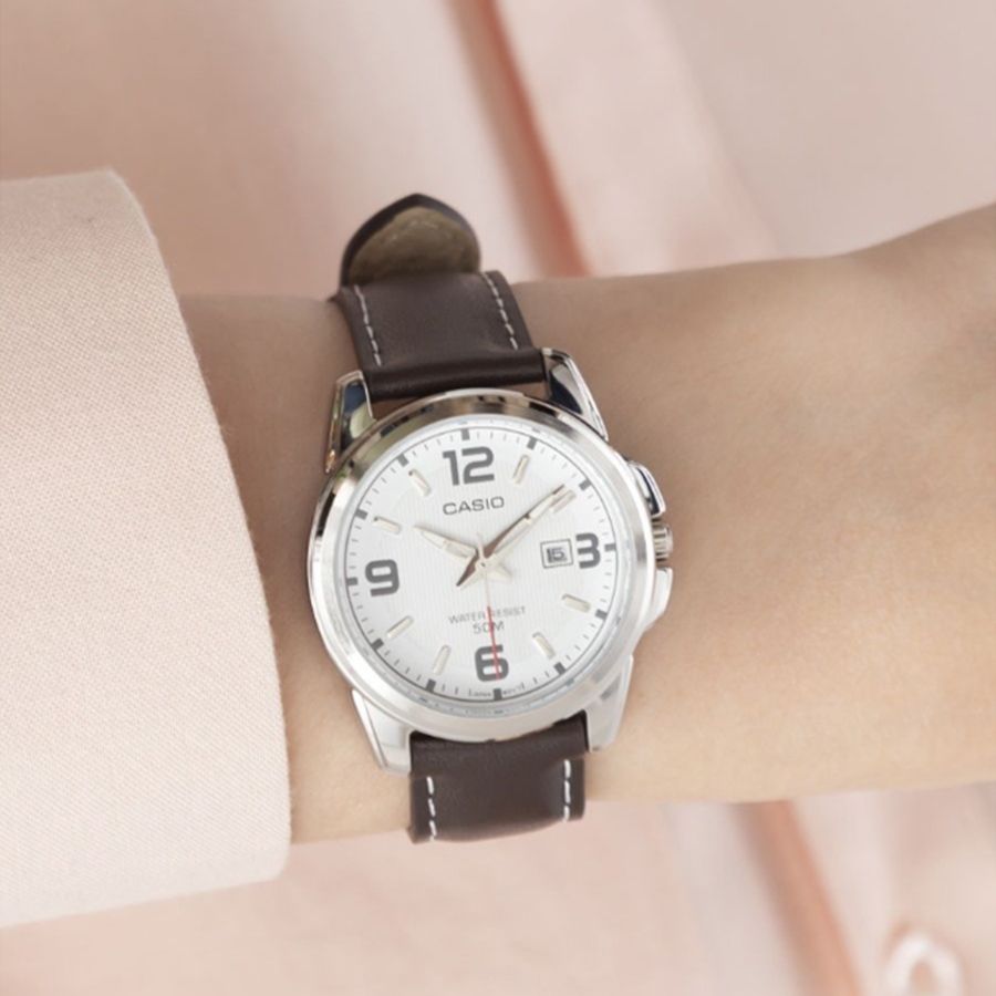 Женские кварцевые аналоговые часы. Серия Casio Collection. Центральные часовая, минутная и секундная стрелки. Белый циферблат с часовыми метками в виде штрихов и четырёх арабских цифр (12, 3, 6 и 9). Стрелки с люминесцентным покрытием, которое светится в темноте после непродолжительного воздействия света. Окошко даты в позиции 3 ч. Устойчивое к мелким механическим повреждениям минеральное стекло. Круглый корпус из гипоаллергенной латуни серебристого цвета. Размер корпуса 33,1 мм на 36,5 мм, толщина 8,8 мм. Рифлёная переводная головка с защитой. Коричневый кожаный ремешок с классической застёжкой buckle. Батарея рассчитана на 3 года. Водонепроницаемость 50WR (допускается мытьё рук, брызги дождя). Вес около 35 г.