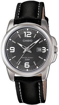 Женские кварцевые аналоговые часы. Серия Casio Collection. Центральные часовая, минутная и секундная стрелки. Серый циферблат с часовыми метками в виде штрихов и четырёх арабских цифр (12, 3, 6 и 9). Стрелки с люминесцентным покрытием, которое светится в темноте после непродолжительного воздействия света. Окошко даты в позиции 3 ч. Устойчивое к мелким механическим повреждениям минеральное стекло. Круглый корпус из гипоаллергенной латуни серебристого цвета. Размер корпуса 33,1 мм на 36,5 мм, толщина 8,8 мм. Рифлёная переводная головка с защитой. Чёрный кожаный ремешок с классической застёжкой buckle. Батарея рассчитана на 3 года. Водонепроницаемость 50WR (допускается мытьё рук, брызги дождя). Вес около 35 г.