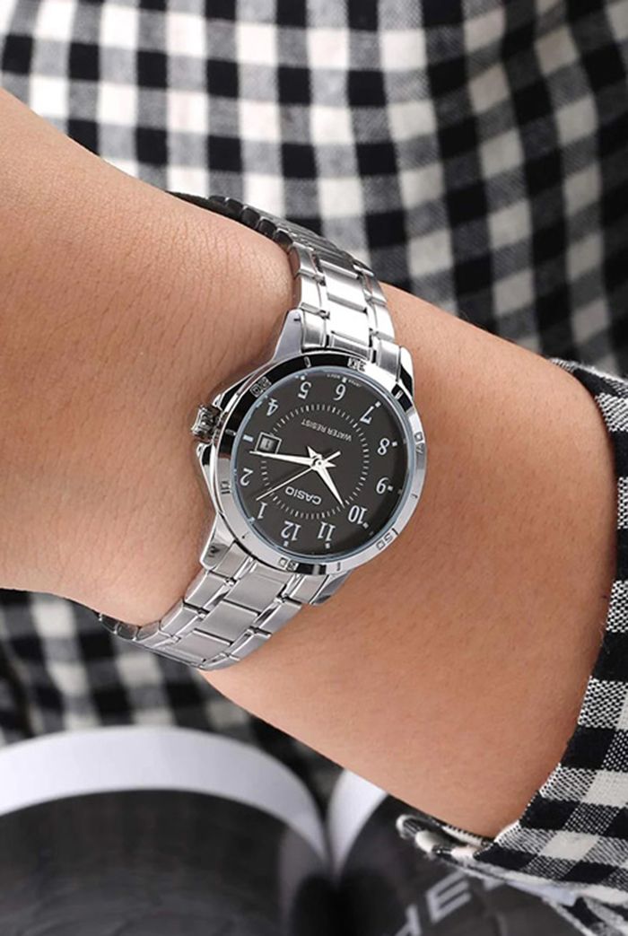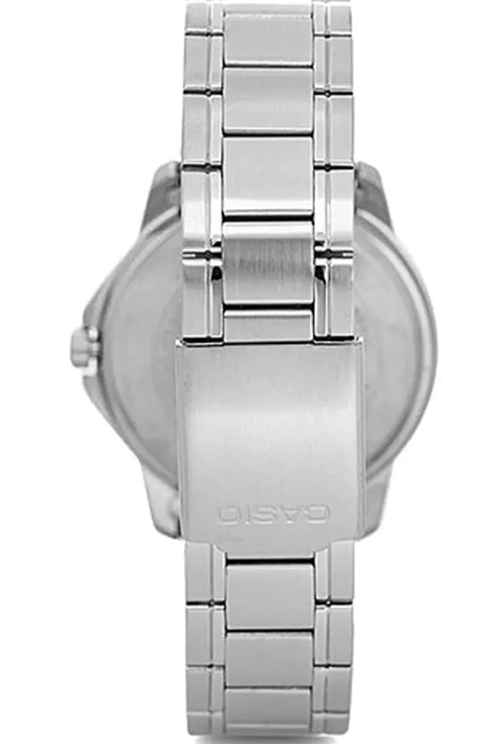 Женские кварцевые аналоговые наручные часы. Серия Casio Collection. Центральные часовая, минутная и секундная стрелки. Чёрный циферблат с часовыми метками в виде арабских цифр. Окошко даты в положении 3 ч. Устойчивое к мелким механическим повреждениям минеральное стекло. Круглый корпус серебристого цвета размером 35.2 мм на 30.2 мм, толщиной 7.8 мм. Рифленая переводная головка с защитой. Минутная шкала на безеле. Стальной браслет с тройной раскладывающейся застежкой. Батарейка рассчитана на 3 года. Водонепроницаемость 30WR (защита от брызг). Вес около 56 г.