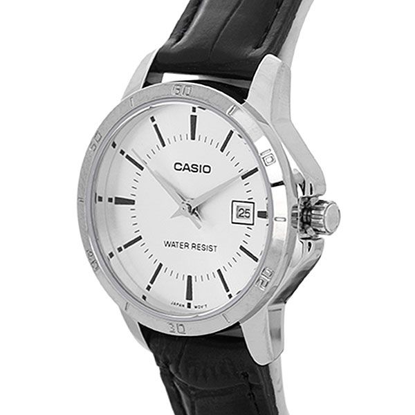 Женские кварцевые аналоговые наручные часы. Серия Casio Collection. Центральные часовая, минутная и секундная стрелки. Серебристый циферблат с часовыми метками в виде штрихов. Апертура даты в позиции 3 ч. Устойчивое к мелким механическим повреждениям минеральное стекло. Круглый корпус серебристого цвета. Размер корпуса 30.2 мм на 35.2 мм, толщина 7.8 мм. Рифлёная переводная головка с защитой. Минутная шкала на безеле. Чёрный кожаный ремешок с классической застёжкой buckle. Батарейка рассчитана на 3 года. Водонепроницаемость 30 WR (защита от брызг). Вес около 28 г.