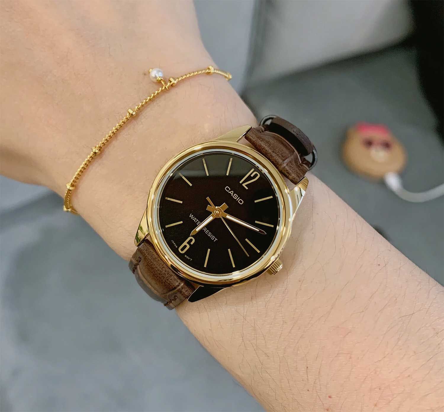 Женские кварцевые часы с аналоговым отображение времени. Серия Casio Collection. Центральные часовая, минутная и секундная стрелки. Чёрный циферблат с часовыми метками в виде штрихов и двух арабских цифр 12 и 6. Стрелки с люминесцентным покрытием, которое светится в темноте после непродолжительного воздействия света. Устойчивое к мелким механическим повреждениям минеральное стекло. Круглый корпус из гипоаллергенной латуни золотистого цвета. Размер корпуса 34 мм на 28,2 мм, толщина 7,5 мм. Рифлёная переводная головка. Коричневый кожаный ремешок с классической застёжкой buckle. Батарейка рассчитана на 3 года. Водонепроницаемость 30WR (защита от брызг). Вес около 24 г.