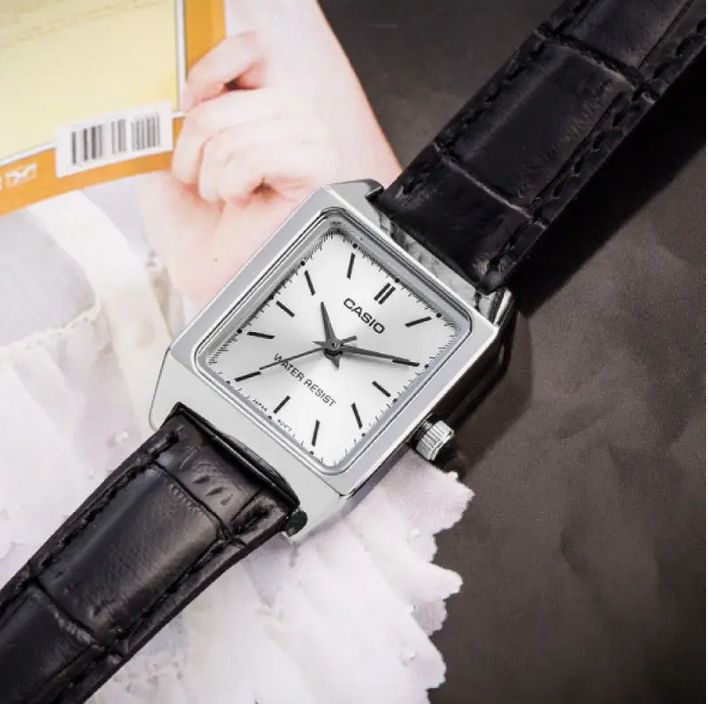 Женские кварцевые аналоговые наручные часы. Серия Casio Collection. Центральные часовая, минутная и секундная стрелки. Серебристый циферблат с часовыми метками в виде штрихов. Устойчивое к мелким механическим повреждениям минеральное стекло. Прямоугольный корпус серебристого цвета размером 31 мм на 22 мм, толщиной 7,5 мм. Рифлёная переводная головка. Чёрный кожаный ремешок с классической застёжкой buckle. Батарейка рассчитана на 3 года. Стальная задняя крышка. Водонепроницаемость 30WR (защита от брызг). Вес около 22 г.