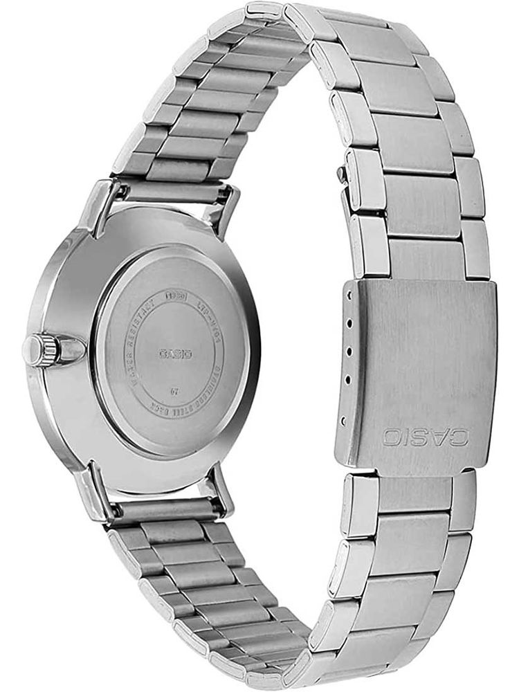 Женские кварцевые часы с аналоговым отображение времени. Серия Casio Collection. Центральные часовая, минутная и секундная стрелки золотистого цвета. Чёрный циферблат с часовыми метками в виде штрихов и двух римских цифр VI и XII. Устойчивое к мелким механическим повреждениям минеральное стекло. Круглый корпус из гипоаллергенной латуни серебристого цвета. Размер корпуса 34 мм на 40 мм, толщина 7,9 мм. Рифлёная переводная головка. Стальной браслет с тройной раскладывающейся застежкой. Батарейка рассчитана на 3 года. Водонепроницаемость 30WR (защита от брызг). Вес около 62 г.