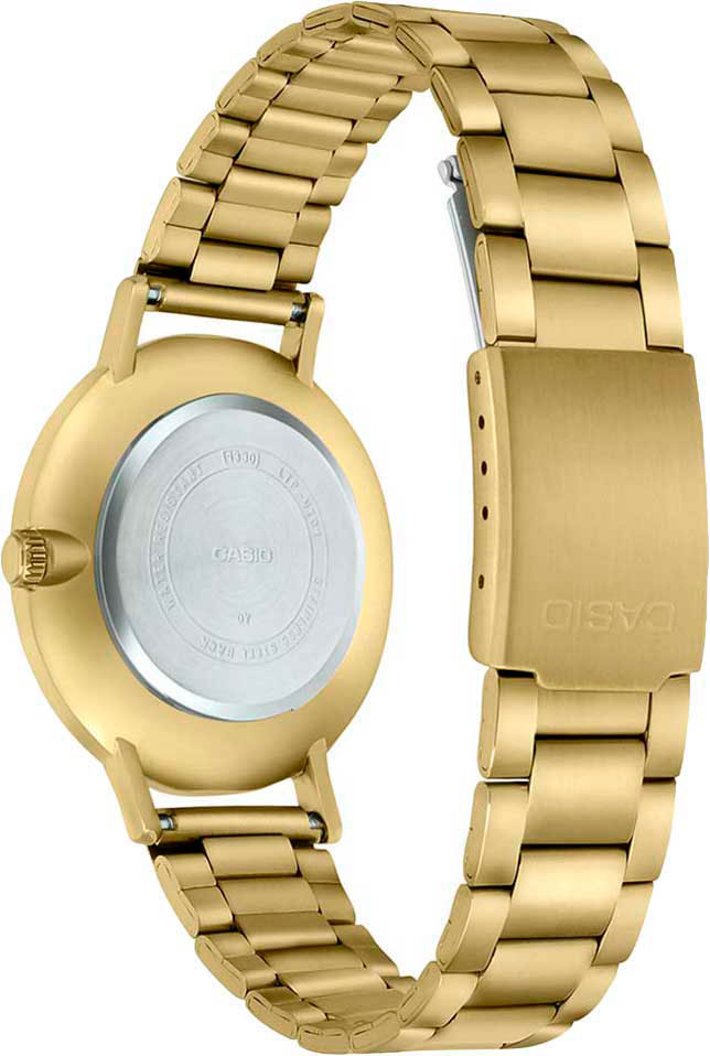 Женские аналоговые кварцевые наручные часы. Серия Casio Collection. Центральные часовая, минутная и секундная стрелки золотистого цвета. Чёрный циферблат с часовыми метками в виде штрихов и двух римских цифр VI и XII. Рифленая переводная головка. Круглый корпус золотистого цвета размером 34 мм на 40 мм, толщиной 7.9 мм. Устойчивое к мелким механическим повреждениям минеральное стекло. Стальной Браслет с IP покрытием цвета жёлтого золота, тройная раскладывающаяся застежка. Батарейка рассчитана на 3 года. Водонепроницаемость WR30 (защита от брызг). Вес около 62 г.