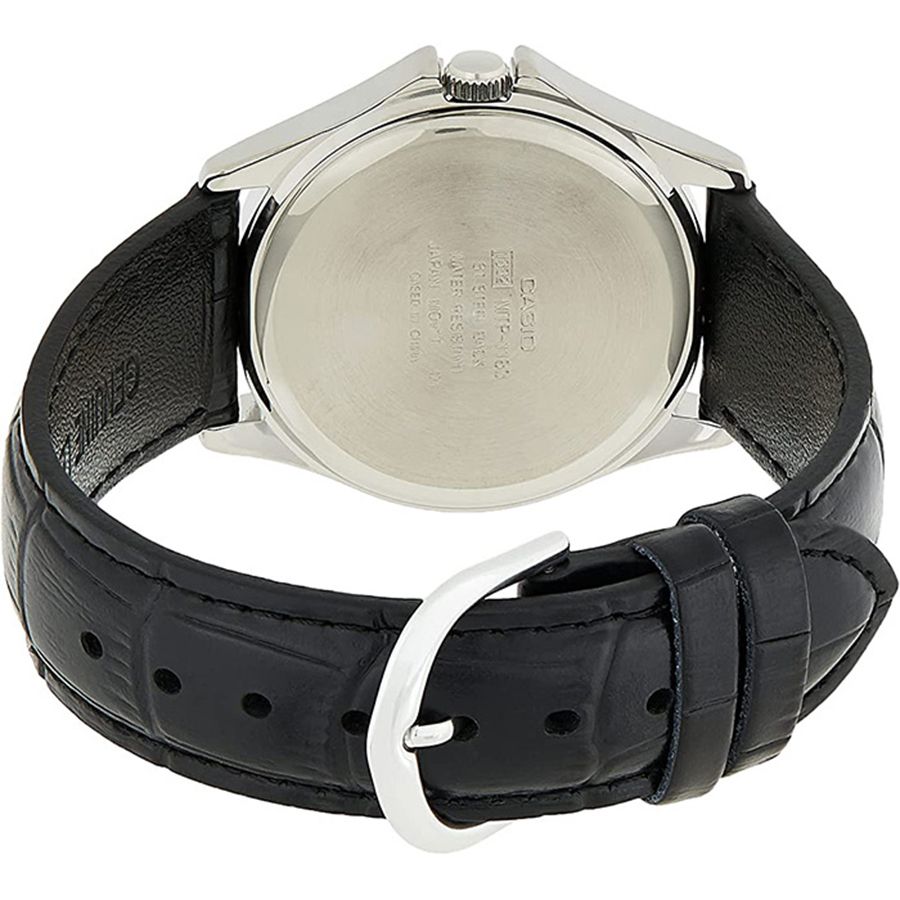 Мужские кварцевые аналоговые наручные часы. Серия Casio Collection. Центральные часовая, минутная и секундная стрелки. Белый циферблат с часовыми метками в виде штрихов. Окошко даты в положении 3 ч. Минутная шкала на циферблате. Устойчивое к мелким механическим повреждениям минеральное стекло. Круглый корпус серебристого цвета. Размер корпуса 38.5 мм на 42 мм, толщина 8.7 мм. Рифлёная переводная головка с защитой. Чёрный кожаный ремешок с классической застежкой buckle. Ширина ремешка 20мм, длина ремешка 205мм. Батарейка рассчитана на 3 года. Водонепроницаемость 30WR (защита от брызг). Вес около 45 г.