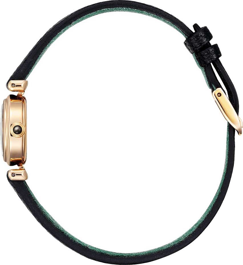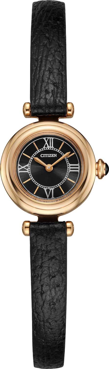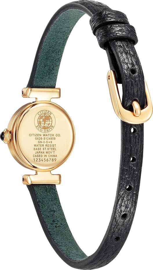 Женские кварцевые часы с системой Eco Drive на солнечной батарее. Калибр механизма G626. Запас хода при полной зарядке около 8 месяцев. Центральные часовая и минутная стрелки. Черный циферблат. Круглый корпус выполнен из нержавеющей стали с IP покрытием. Диаметр корпуса составляет 18,4 мм, толщина 6,8 мм. Черный кожаный ремешок. Прочное минеральное стекло устойчивое к мелким механическим повреждениям. Водостойкость WR 30 (брызги). Вес 20 г.