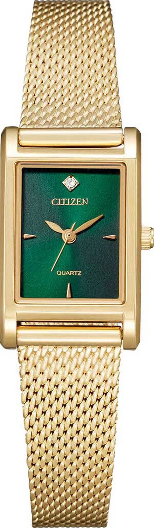 Женские кварцевые наручные часы с аналоговым отображением времени. Центральные часовая, минутная и секундная стрелки золотистого цвета. Зелёный циферблат с часовыми метками в виде трёх золотистых штрихов выполнен по технологии Sunray (солнечные лучи). Отметка 12 часов украшена кристаллом. Прямоугольный стальной корпус с IP покрытием цвета жёлтого золота. Устойчивое к мелким механическим повреждениям минеральное стекло. Браслет миланского плетения из нержавеющей стали с IP покрытием цвета жёлтого золота, регулируемая застежка. Водонепроницаемость WR 50 (мытьё рук, дождь). Вес около 31 г.