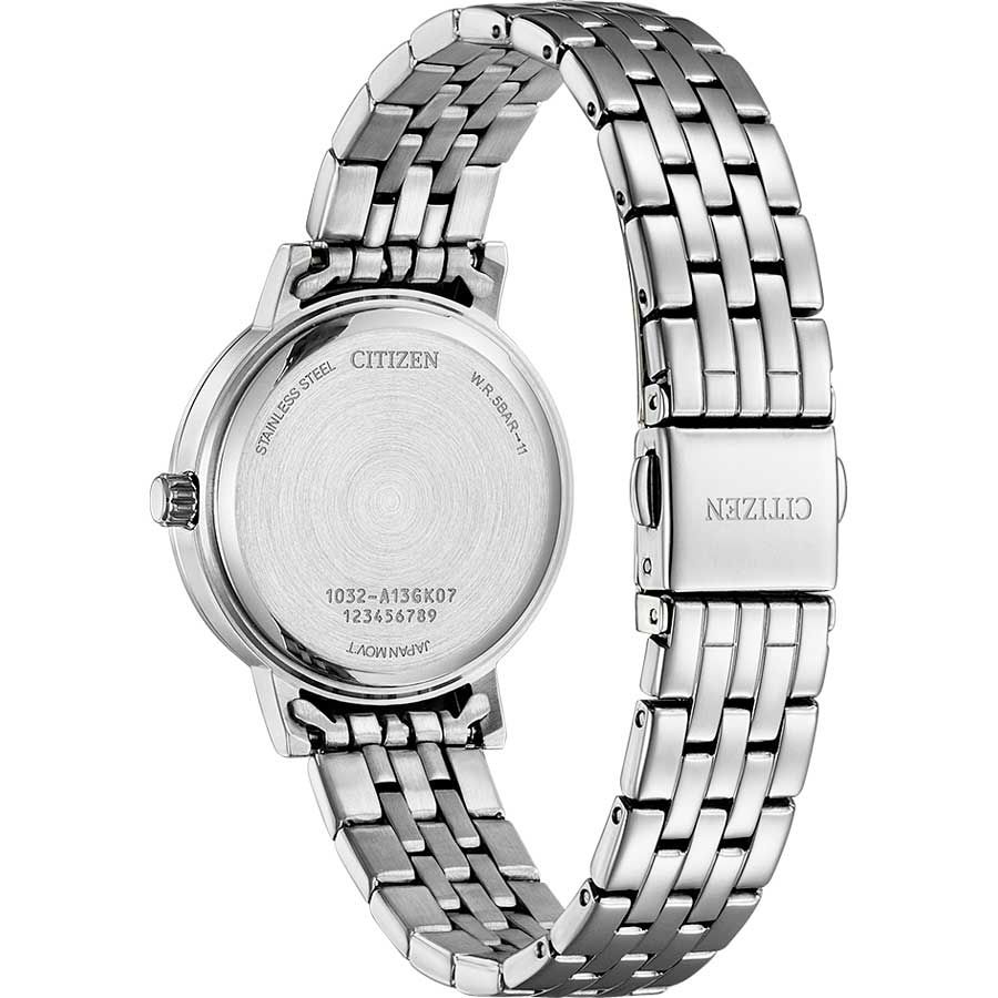 Женские кварцевые наручные часы с аналоговым отображением времени. Коллекция Eleganc. Калибр механизма Citizen 1032. Центральные часовая, минутная и секундная стрелки серебристого цвета. Перламутровый синий циферблат с часовыми метками в виде штрихов, точек и арабской цифры 12. Круглый стальной корпус диаметром 31 мм, толщиной 7 мм. Безель и циферблат украшены кристаллами. Устойчивое к мелким механическим повреждениям минеральное стекло. Стальной браслет с раскладывающейся застежкой. Водонепроницаемость 50WR (мытьё рук, дождь). Вес около 65 г.