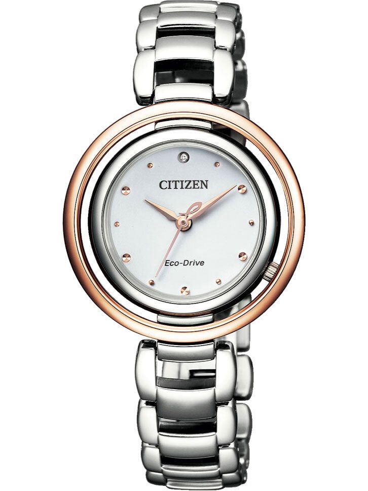Женские кварцевые аналоговые наручные часы. Коллекция Citizen L Luxury. Калибр механизма E031. Часы оснащены системой питания и подзарядки от солнечного света Eco-Drive не требующей замены батарейки. Система Eco-Drive - патентованная технология компании Citizen заключающаяся в размещении фотоэлементов под циферблатом и постоянно подзаряжающих аккумулятор часов при попадании солнечного света на циферблат. Система предупреждения о низком уровне заряда аккумулятора и предотвращения перезарядки. Запас хода при полной зарядке аккумулятора около 180 дней. Функция индикации заряда (EOL - End of Life – в случае, если заряд элемента питания ослабевает, секундная стрелка начинает двигаться через деления). Центральные часовая, минутная и секундная стрелки золотистого цвета. Белый циферблат с часовыми метками в виде точек. Циферблат украшен кристаллом. Круглый стальной корпус с частичным покрытием цвета розового золота. Диаметр корпуса 30,5 мм, толщина 7,4 мм. Устойчивое к мелким царапинам сапфировое стекло. Браслет из нержавеющей стали с застежкой-бабочкой. Водозащита WR 50 (мытьё рук, дождь). Вес примерно 50 г.