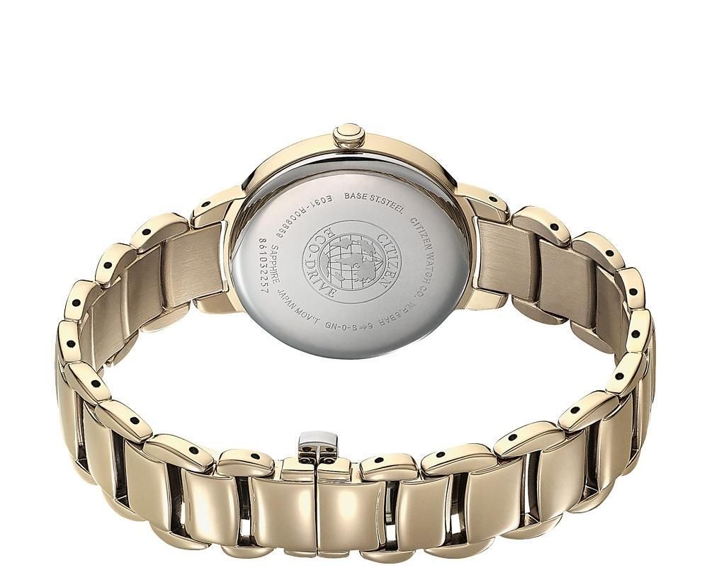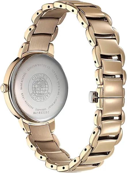 Женские кварцевые аналоговые наручные часы на солнечной батарее. Коллекция Eco-Drive Elegance. Калибр механизма Citizen E031. Часы оснащенный системой питания и подзарядки от солнечного света Eco-Drive не требующей замены батарейки. Система Eco-Drive - патентованная технология Citizen, заключающаяся в размещении фотоэлементов скрытых под циферблатом и постоянно заряжающих аккумулятор часов при попадании солнечного света на циферблат. Запас хода до 180 дней от полностью заряженной батареи. Функция индикации заряда (EOL - End of Life) – в случае ослабевания заряда элемента питания секундная стрелка перемещается с интервалом в 2 секунды. Функция предотвращения перезарядки. Центральные часовая, минутная и секундная стрелки. Перламутровый циферблат с часовыми метками в виде штрихов. Круглый стальной корпус с IP покрытием цвета розового золота. Диаметр корпуса 31 мм, толщина 8 мм. Устойчивое к возникновению мелких царапин сапфировое стекло. Стальной браслет с IP покрытием цвета розового золота, тройная раскладывающаяся застежка. Ширина браслета 10 мм. Водонепроницаемость 50WR (мытьё рук, дождь). Вес около 71 г.