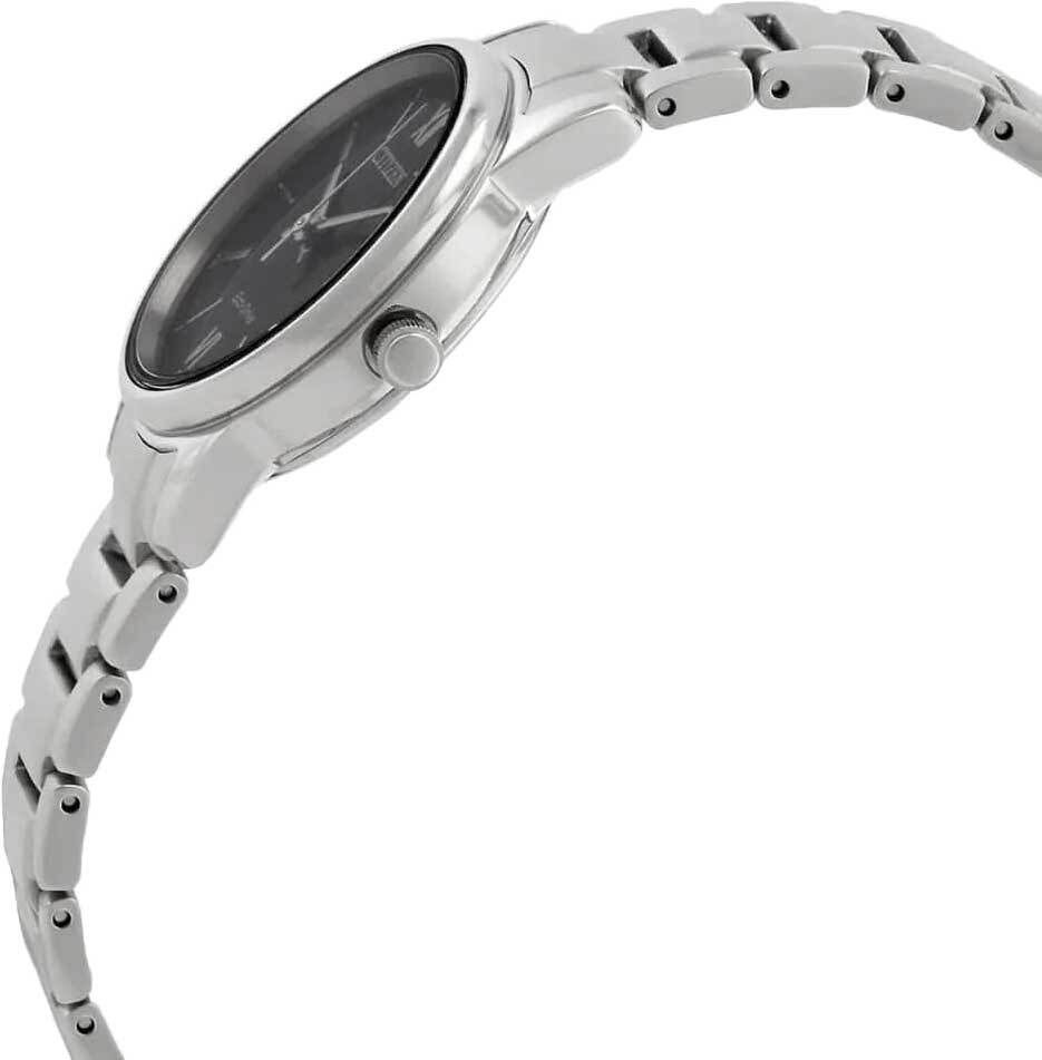 Женские кварцевые аналоговые наручные часы на солнечной батарее. Коллекция Eco-Drive Elegance. Калибр механизма Citizen E011. Питание от солнечной энергии - часы оснащены системой Eco-Drive не требующей замены батарейки. Система Eco-Drive - патентованная технология Citizen, заключающаяся в размещении фотоэлементов скрытых под циферблатом и постоянно заряжающих аккумулятор часов при попадании солнечного света на циферблат. Запас хода до 180 дней от полностью заряженной батареи. Функция индикации заряда (EOL - End of Life) – в случае ослабевания заряда элемента питания секундная стрелка перемещается через 2 деления. Функция предотвращения перезарядки. Центральные часовая, минутная и секундная стрелки. Чёрный циферблат с часовыми метками в виде штрихов и двух римских цифр VI и XII. Индикация даты в позиции 3 часов. Круглый корпус из нержавеющей стали диаметром 27,5 мм, толщиной 7,4 мм. Устойчивое к возникновению мелких царапин сапфировое стекло. Стальной браслет с раскладывающейся застежкой. Водонепроницаемость 50WR (мытьё рук, дождь). Вес около 57 г.