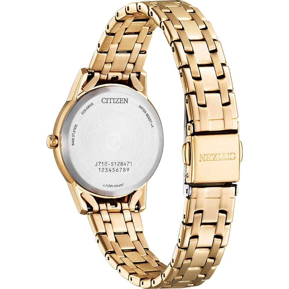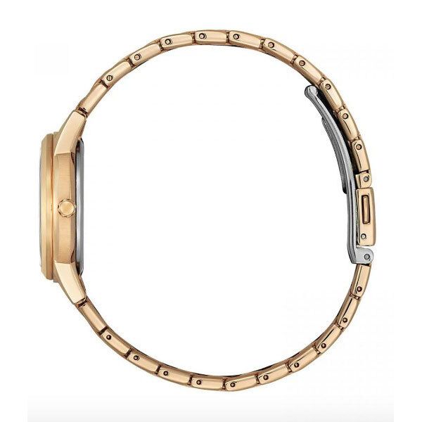 Женские кварцевые часы на солнечной батарее. Калибр механизма J710. Запас хода 240 дней. Функция индикации заряда (EOL). Центральные часовая, минутная и секундная стрелки. Апертура даты в позиции 3 часов. Светло-серебристый циферблат украшен кристаллами. Светонакопительный состав на стрелках. Круглый корпус выполнен из нержавеющей стали с PVD покрытием цвета розового золота. Диаметр корпуса составляет 29 мм. Стальной браслет с покрытием, раскладывающаяся застежка. Прочное минеральное стекло устойчивое к мелким механическим повреждениям. Водостойкость WR 30 (брызги).