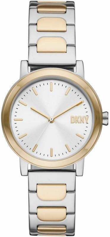 Женские кварцевые аналоговые наручные часы. Коллекция Soho. Центральные часовая, минутная и секундная стрелки. Серебристый циферблат с часовыми метками в виде штрихов. Циферблат украшен логотипом бренда. Круглый корпус из нержавеющей стали, безель с покрытием цвета жёлтого золота. Диаметр корпуса 34 мм. Устойчивое к мелким механическим повреждениям минеральное стекло. Стальной браслет с частичным покрытием цвета жёлтого золота, раскладывающаяся застежка. Ширина браслета 16 мм. Водозащита 50WR (мытьё рук).