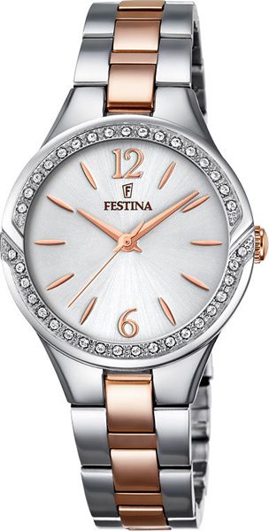 Женские кварцевые аналоговые наручные часы. Круглый стальной корпус. Центральная секундная стрелка. Корпус украшен кристаллами. Стальной браслет.