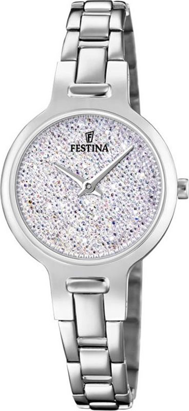 Женские кварцевые аналоговые наручные часы. Коллекция Festina Mademoiselle. Круглый стальной корпус. Циферблат украшен кристаллами Swarovski. Стальной браслет.