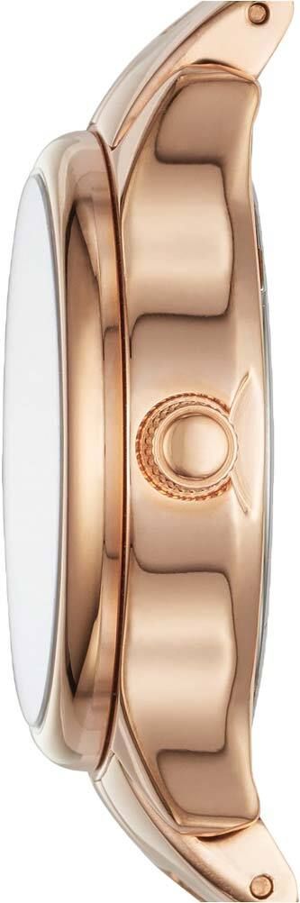 Женские кварцевые часы. Центральные часовая, минутная и секундная стрелки. Розовый циферблат украшен кристаллами. Круглый корпус выполнен из полированной нержавеющей стали с IP покрытием цвета розового золота. Диаметр корпуса составляет 30 мм. Стальной браслет с покрытием шириной 14 мм, раскладывающаяся застежка. Прочное минеральное стекло устойчивое к мелким механическим повреждениям. Водостойкость WR 50 (мытье рук, дождь).