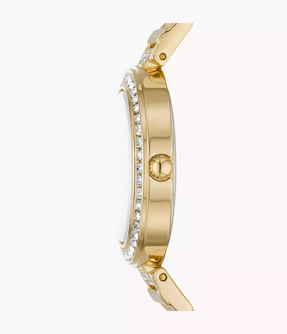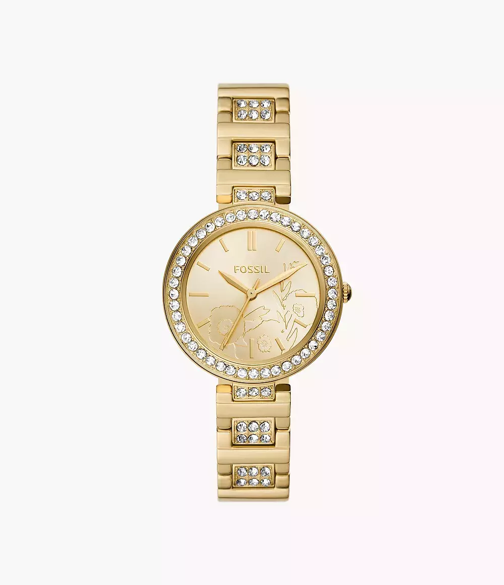 Женские кварцевые аналоговые наручные часы. Коллекция KARLI. Круглый стальной корпус, золотистый циферблат. Безель цвета жёлтого золота украшен кристаллами. Центральные часовая, минутная и секундная стрелки. Устойчивое к царапинам минеральное стекло. Стальной браслет с IP-покрытием цвета жёлтого золота украшен кристаллами. Водостойкость WR 50.