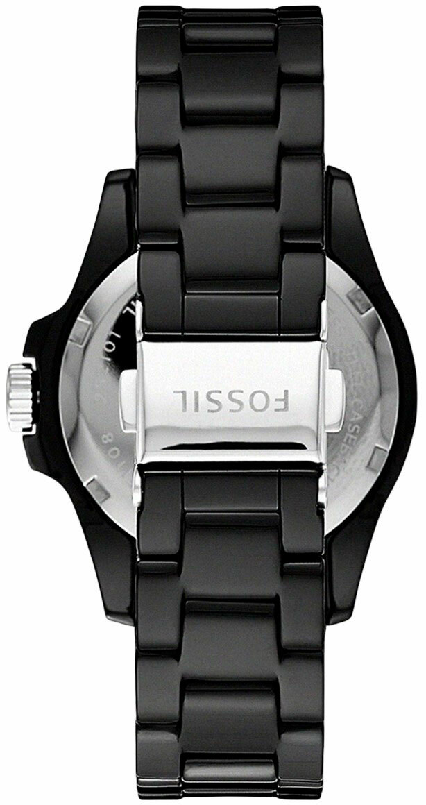 Женские аналоговые кварцевые наручные часы. Коллекция FB-01. Центральные часовая, минутная и секундная стрелки. Стрелки с люминесцентным покрытием, которое светится в темноте после непродолжительного нахождения на свету. Чёрный циферблат с часовыми метками в виде кристаллов. Круглый корпус из нержавеющей стали с покрытием чёрного цвета. Диаметр корпуса 36 мм. Устойчивое к мелким механическим повреждениям минеральное стекло. Рифленая переводная головка с защитой. Чёрный керамический браслет с раскладывающейся застежкой. Водозащищённость 100WR (плавание с маской и трубкой).