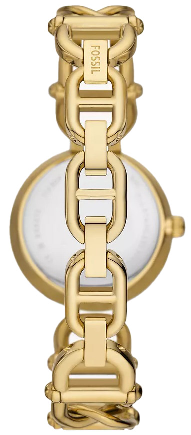 Женские кварцевые аналоговые наручные часы. Коллекция Fossil Carlie. Центральные часовая, минутная и секундная стрелки. Круглый корпус из нержавеющей стали с PVD-покрытием цвета жёлтого золота. Циферблат белого цвета. Диаметр корпуса 30 мм. Устойчивое к мелким механическим повреждениям минеральное стекло. Браслет из нержавеющей стали с PVD-покрытием цвета жёлтого золота. Водостойкость WR 50 (плавание без погружения).