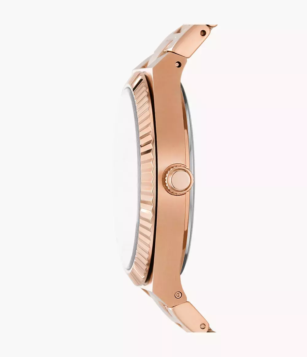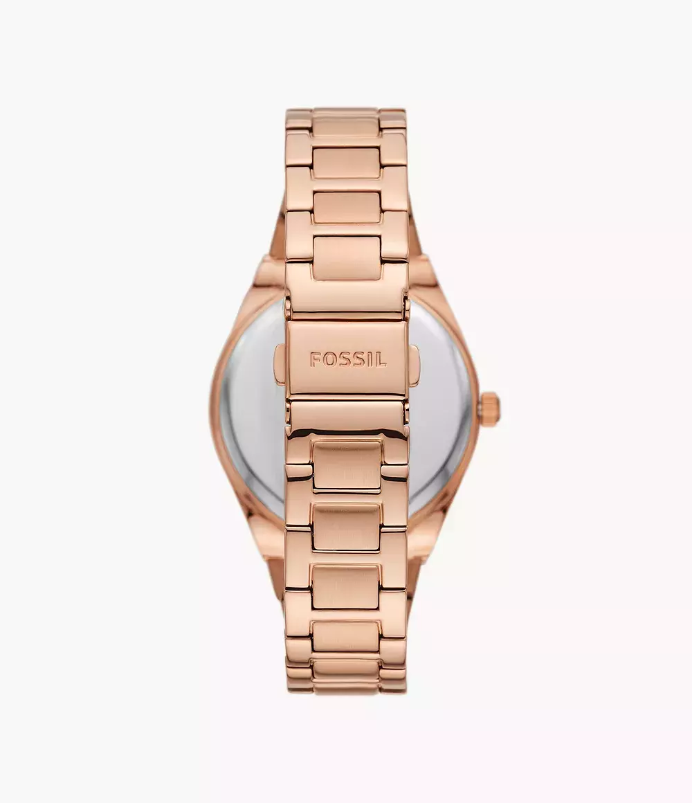 Женские кварцевые аналоговые наручные часы. Коллекция Fossil Scarlette. Центральные часовая, минутная и секундная стрелки. Круглый корпус из нержавеющей стали с PVD-покрытием цвета розового золота. Циферблат зелёного цвета. Рифлёный безель. Циферблат украшен изображением бабочек, кристаллами. Диаметр корпуса 38 мм. Устойчивое к мелким механическим повреждениям минеральное стекло. Браслет из нержавеющей стали с PVD-покрытием цвета розового золота. Водостойкость WR 50 (плавание без погружения).