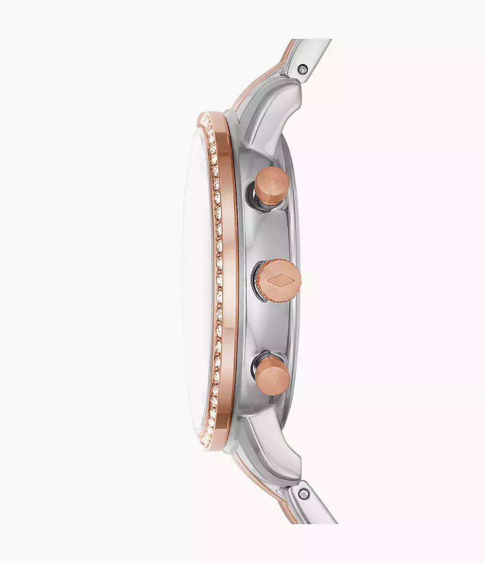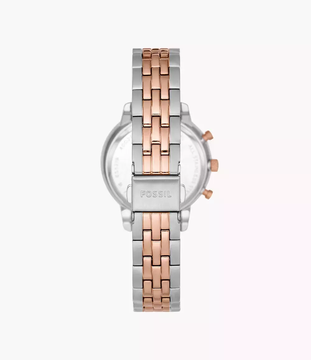 Женские кварцевые аналоговые наручные часы-хронограф с секундомером. Коллекция Fossil Neutra. Центральные часовая и минутная стрелки. Секундная стрелка вынесена на дополнительный малый циферблат. Стрелки и часовые метки покрыты люминесцентным составом (светятся в темноте после нахождения на свету). Индикация даты в положении между 4 и 5 ч. 24 х часовой формат времени на дополнительном малом циферблате. Круглый корпус из нержавеющей стали. Диаметр корпуса 36 мм. PVD покрытие цвета розового золота на безеле. Безель укркшен кристаллами. Перламутровый циферблат. Устойчивое к мелким механическим повреждениям минеральное стекло. Стальной двухцветный браслет (серебристый, розовое золото). Водозащищённость 50 WR (плавание без погружения).