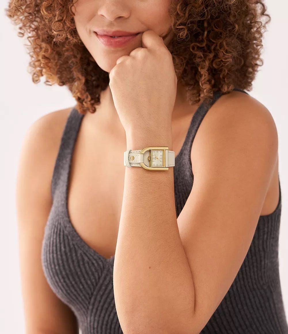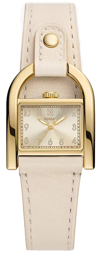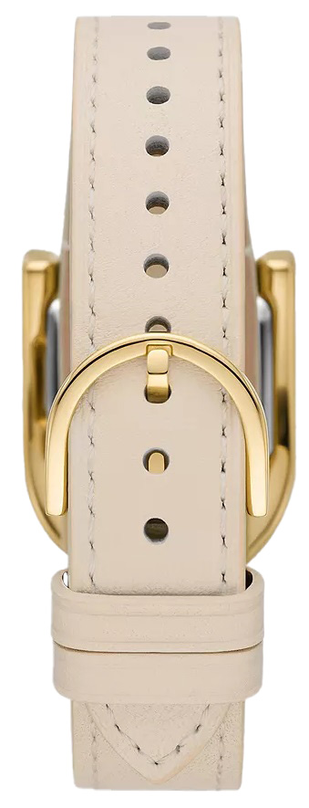 Женские кварцевые аналоговые наручные часы. Коллекция Fossil Harwell. Центральные часовая, минутная и секундная стрелки. На стрелки нанесено люминесцентное покрытие (светятся в темноте после нахождения на свету). Рифлёная переводная головка в положении 12 ч. Прямоугольный корпус из нержавеющей стали с PVD-покрытием цвета жёлтого золота. Циферблат бежевого цвета. Устойчивое к мелким механическим повреждения минеральное стекло. Кожаный ремешок бежевого цвета. Водостойкость WR 30 брызги).