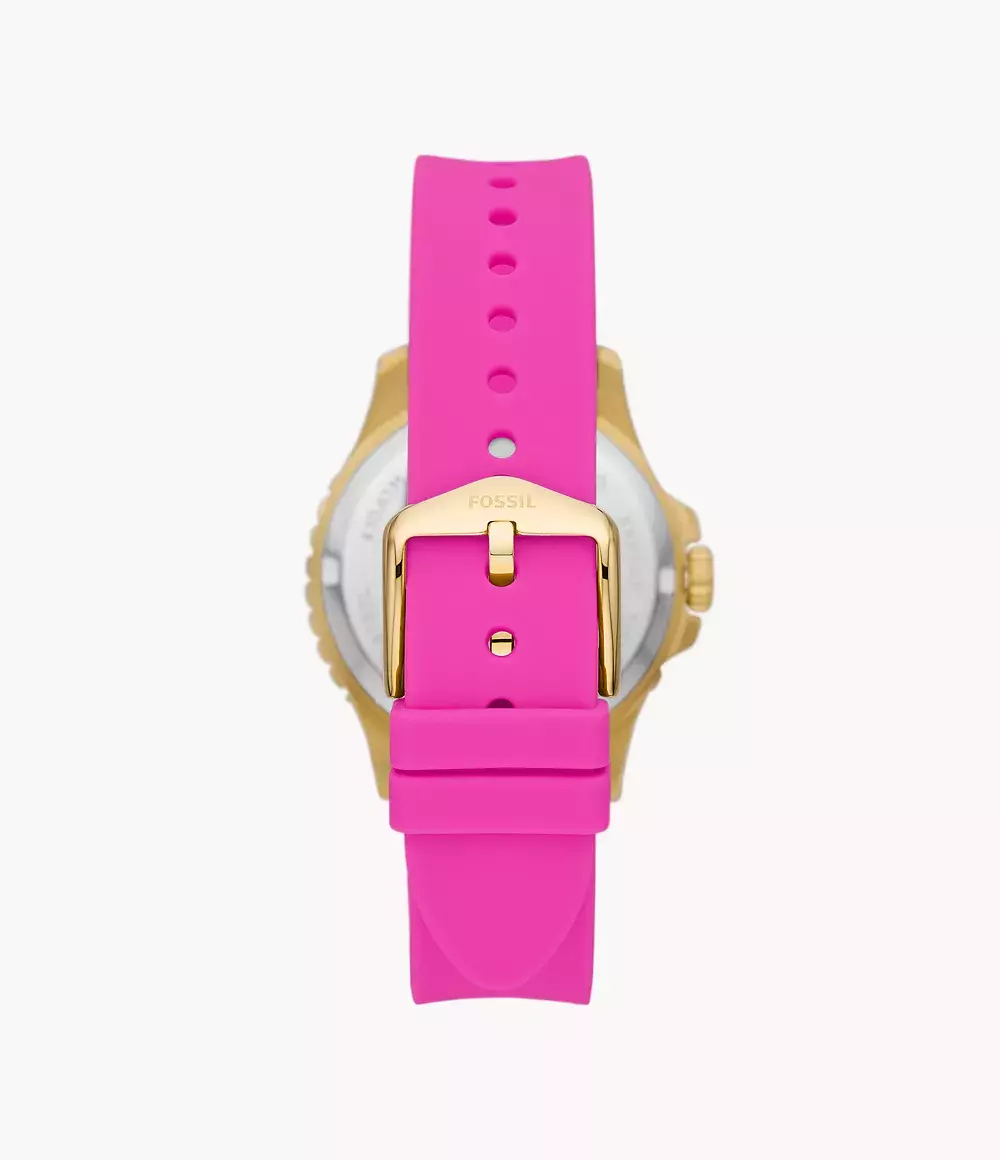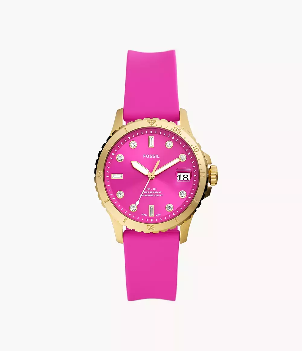 Женские кварцевые аналоговые наручные часы. Коллекция Fossil FB-01. Центральные часовая, минутная и секундная стрелки. На стрелки нанесено люминесцентное покрытие (светятся в темноте после нахождения на свету). Индикация даты в положении 3 ч. Круглый корпус из нержавеющей стали с PVD-покрытием цвета жёлтого золота.. Диаметр корпуса 36 мм. Циферблат розового цвета украшен кристаллами. Устойчивое к мелким механическим повреждения минеральное стекло. Пластиковый ремешок розового цвета. Водостойкость WR 100 (плавание и ныряние без акваланга).