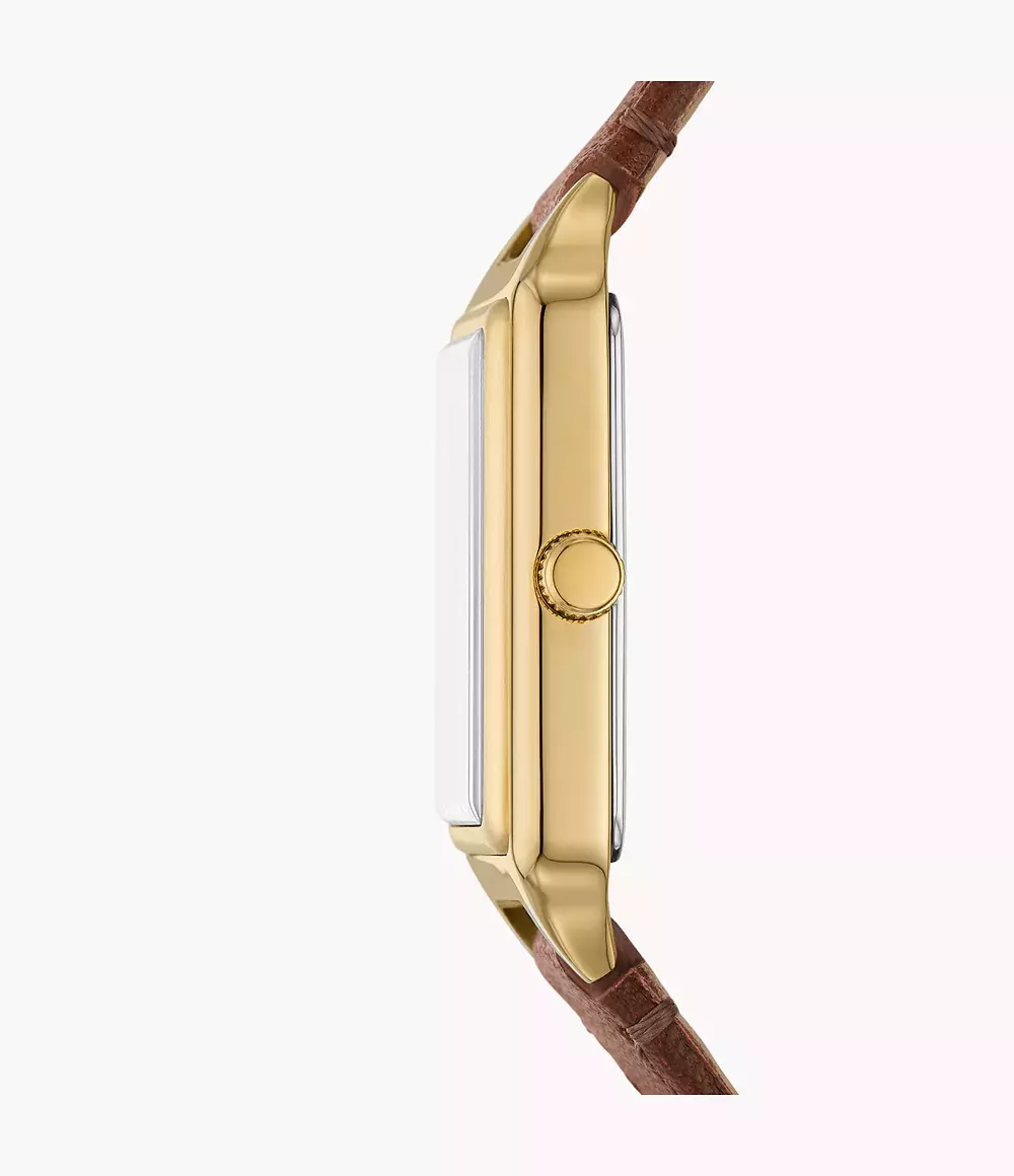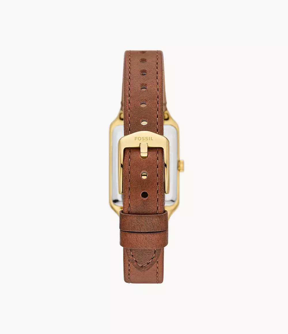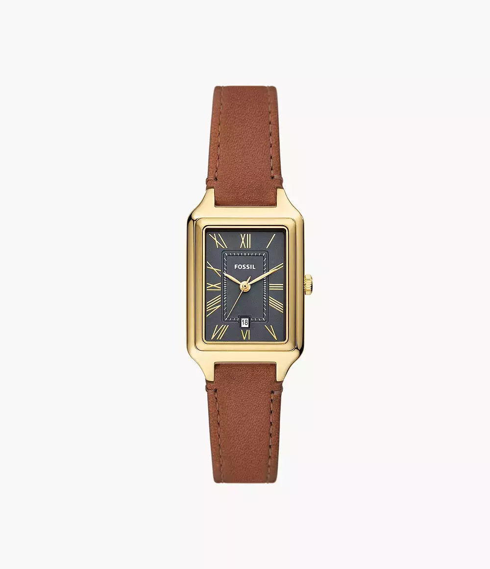 Женские аналоговые кварцевые часы. Коллекция Raquel. Центральные часовая, минутная и секундная стрелки. Серый циферблат с часовыми метками в виде римских цифр. Окошко даты в положении 6 ч. Прямоугольный корпус из нержавеющей стали с покрытием цвета жёлтого золота. Размеры корпуса: ширина 23 мм, высота 30 мм. Устойчивое к мелким механическим повреждениям минеральное стекло. Кожаный ремешок коричневого цвета с классической застёжкой buckle. Ширина ремешка 12 мм. Водонепроницаемость 50 WR (мытьё рук, дождь).
