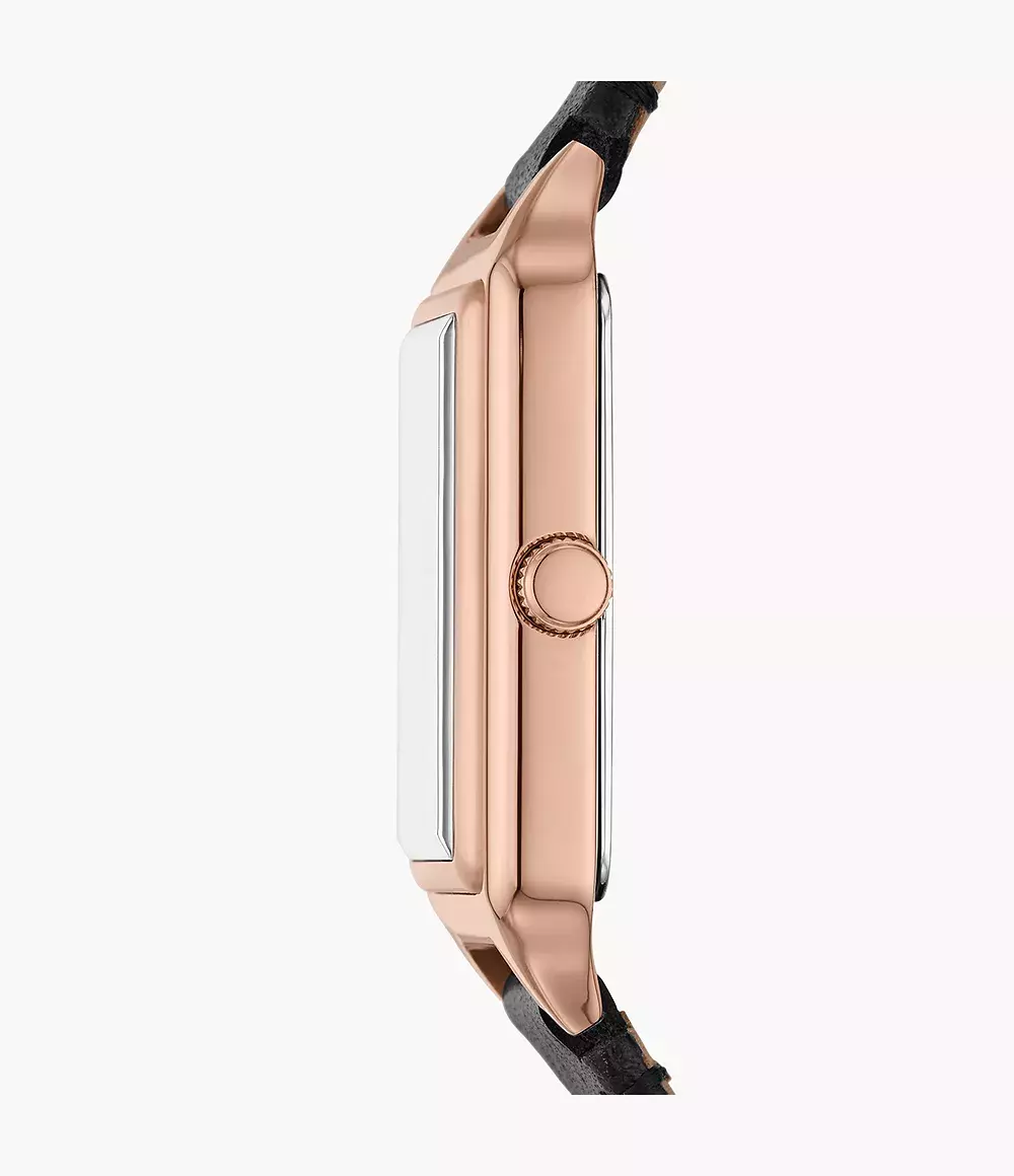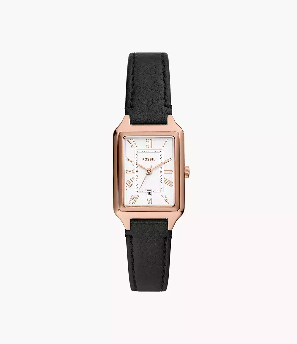 Женские аналоговые кварцевые часы. Коллекция Raquel. Центральные часовая, минутная и секундная стрелки. Белый циферблат с часовыми метками в виде римских цифр. Окошко даты в положении 6 ч. Прямоугольный корпус из нержавеющей стали с покрытием цвета розового золота. Размеры корпуса: ширина 23 мм, высота 30 мм. Устойчивое к мелким механическим повреждениям минеральное стекло. Кожаный ремешок чёрного цвета с классической застёжкой buckle. Ширина ремешка 12 мм. Водонепроницаемость 50 WR (мытьё рук, дождь).