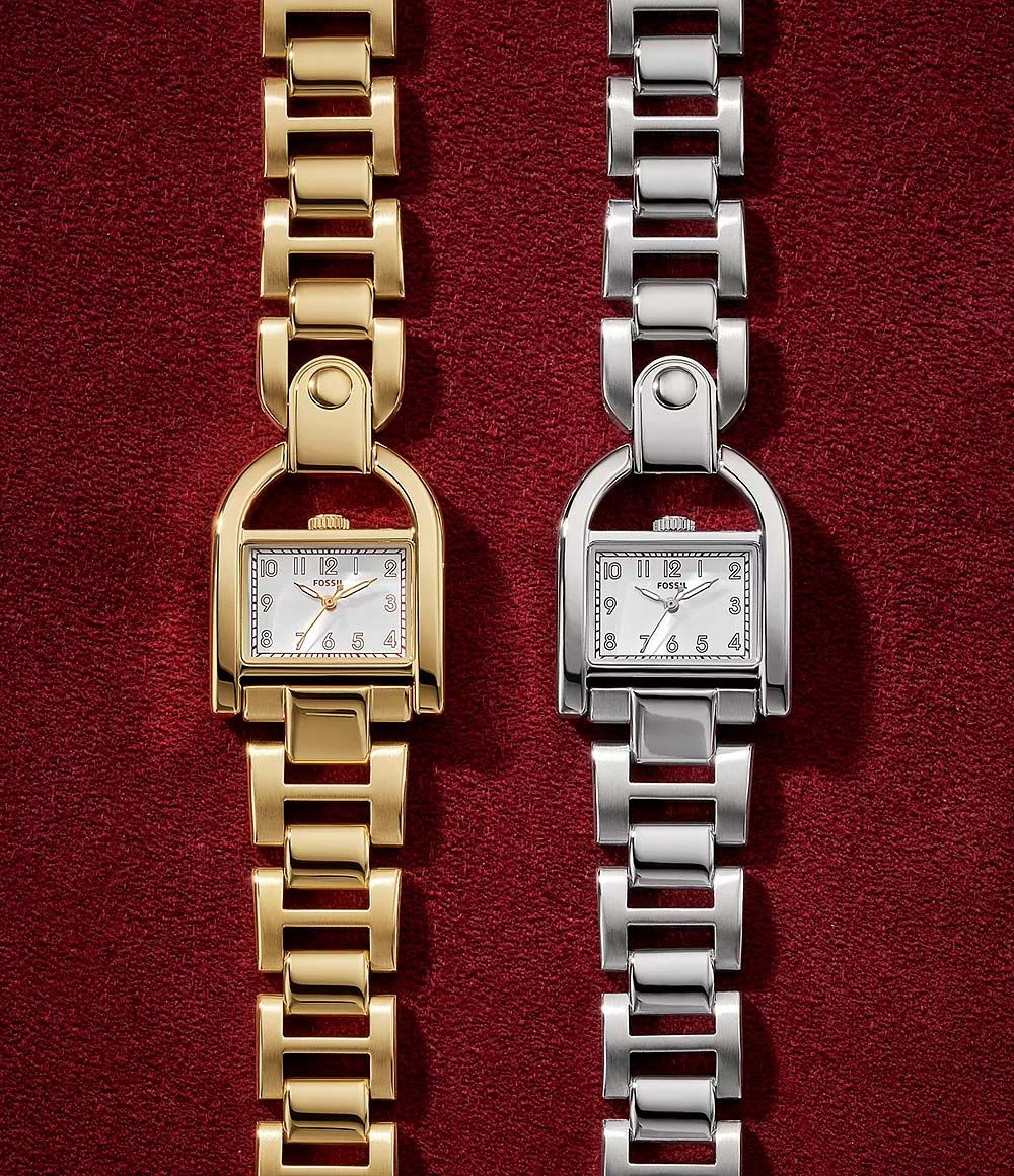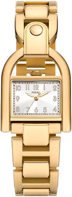 Женские кварцевые аналоговые наручные часы. Коллекция Harwell. Центральные часовая, минутная и секундная стрелки. Стрелки с люминесцентным покрытием, которое светится в темноте после непродолжительного воздействия света. Серебристый циферблат с часовыми метками в виде арабских цифр. Прямоугольный стальной корпус с покрытием цвета жёлтого золота, напоминающий замок. Рифленая переводная головка в положении 12 ч. Устойчивое к мелким механическим повреждениям минеральное стекло. Стальной браслет с покрытием цвета жёлтого золота, застежка Adjust-O-Matic. Ширина браслета 20 мм. Водозащита 30WR (брызги).