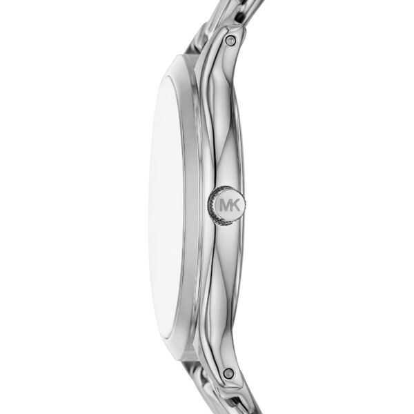 Женские кварцевые аналоговые наручные часы. Коллекция Runway. Центральные часовая, минутная и секундная стрелки. Серебристый циферблат с часовыми метками в виде штрихов. Круглый стальной корпус. Рифленая переводная головка. Устойчивое к мелким механическим повреждениям минеральное стекло. Стальной браслет — цепочка. Водозащита 50WR (мытьё рук, дождь).