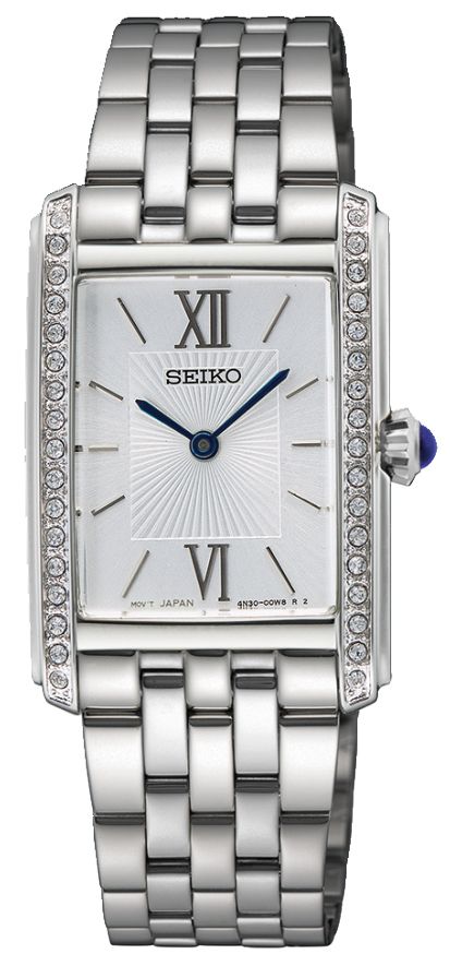 Женские аналоговые кварцевые наручные часы. Калибр механизма 4N30. Центральные часовая и минутная стрелки. Серебристый циферблат с часовыми метками в виде штрихов и двух римских цифр XII и VI. Прямоугольный стальной корпус украшен кристаллами. Размеры корпуса 22,7мм на 33,1 мм, толщина 7,2 мм. Стекло Хардлекс (Hardlex) - закаленное минеральное стекло, разработанное компанией Seiko Watch Corporation, обладающее повышенной устойчивостью к мелким механическим повреждениям и царапинам. Рифлёная переводная головка украшена вставкой в форме кабошона. Стальной браслет с тройной раскладывающейся застёжкой. Ширина браслета 16 мм. Батарейка рассчитана на 3 года. Водонепроницаемость WR30 (защита от брызг). Вес около 63 г.